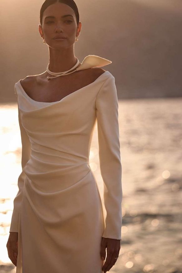 Sfavillante abito da sposa a linea A da principessa. Corsetto strutturato con vita segnata e drappeggi delicati, scollo a cuore incorniciato da ampie spalline scese e gonna piena con lungo strascico.