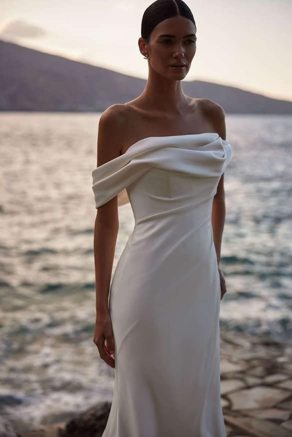 Sfavillante abito da sposa a linea A da principessa. Corsetto strutturato con vita segnata e drappeggi delicati, scollo a cuore incorniciato da ampie spalline scese e gonna piena con lungo strascico.